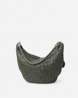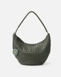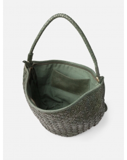 Washed, braided and die-cut cowhide medium hobo bag. Shoulder strap. Zip closure. Internal pockets. Cotton lining.