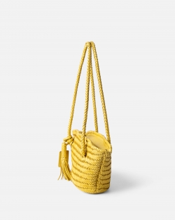 Small braided cowhide leather basket bag. Zip closure. Interior pockets. Cotton lining.