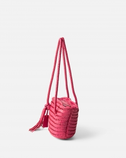 Small braided cowhide leather basket bag. Zip closure. Interior pockets. Cotton lining.