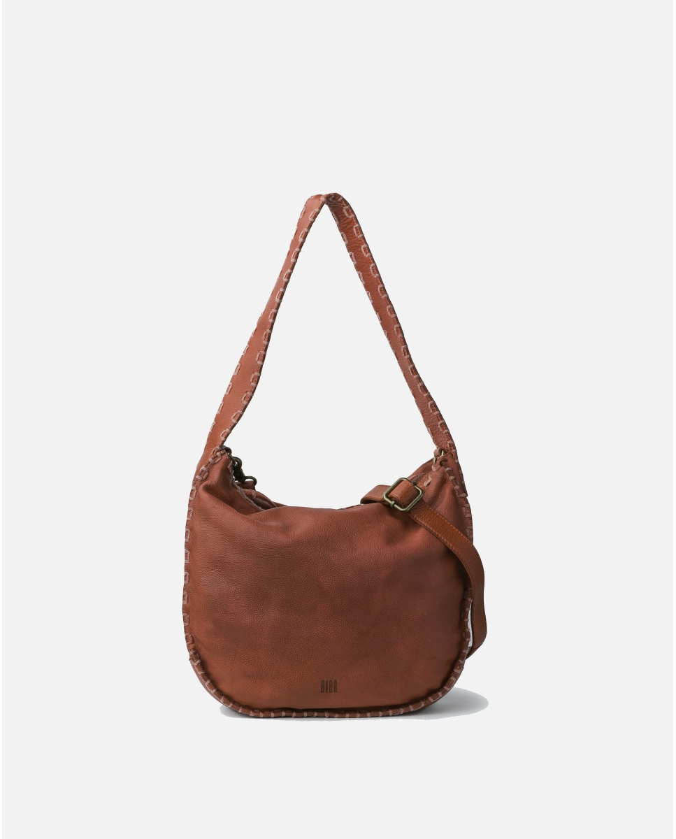 Washed cowhide hobo. Decorative thick thread stitching. Removable and adjustable shoulder strap. Zipper closure. External and internal pockets. Cotton lining.