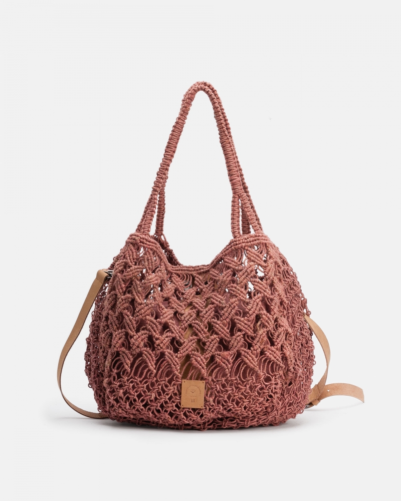 2 in 1* Jute shopping bag with a handmade macramé finish. Recycled cotton inner bag. Adjustable and removable shoulder strap.