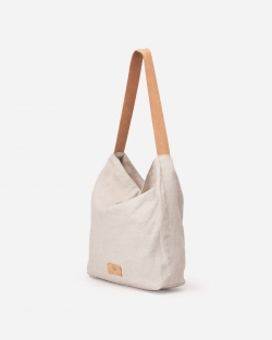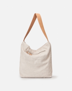 Linen hobo, leather handles, external and internal pockets, zip closure, and cotton lining.
