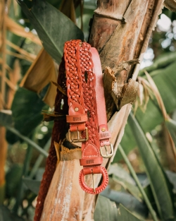 Hand-braided cowhide leather belt. Back screw to cut it manually. Old gold buckle.
