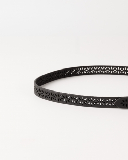 Laser-cut washed bovine leather belt. 2?cm wide. Rear screw for manual length adjustment. Square buckle in antique gold tone.