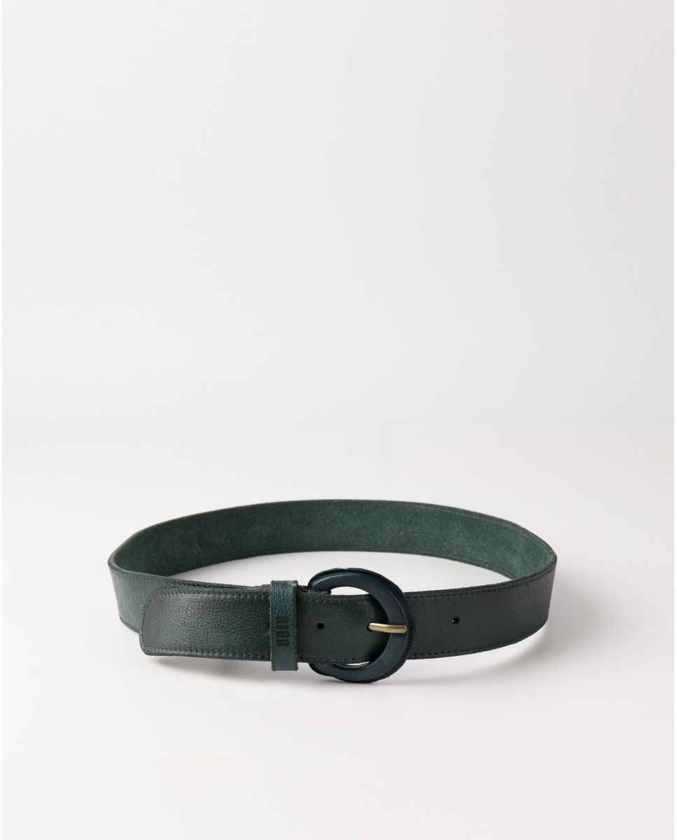 Washed bovine leather belt. 4?cm wide. Rear screw for manual length adjustment. Round buckle wrapped in leather.