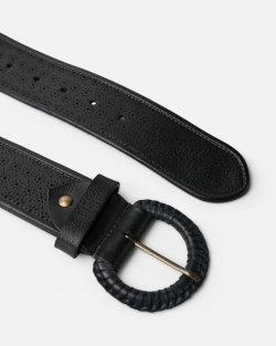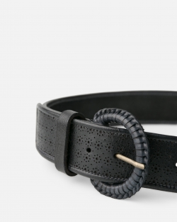 Cowhide belt. Die-cut with floral motif. 5cm wide. Rear screw for manual cutting. Leather-lined buckle.