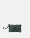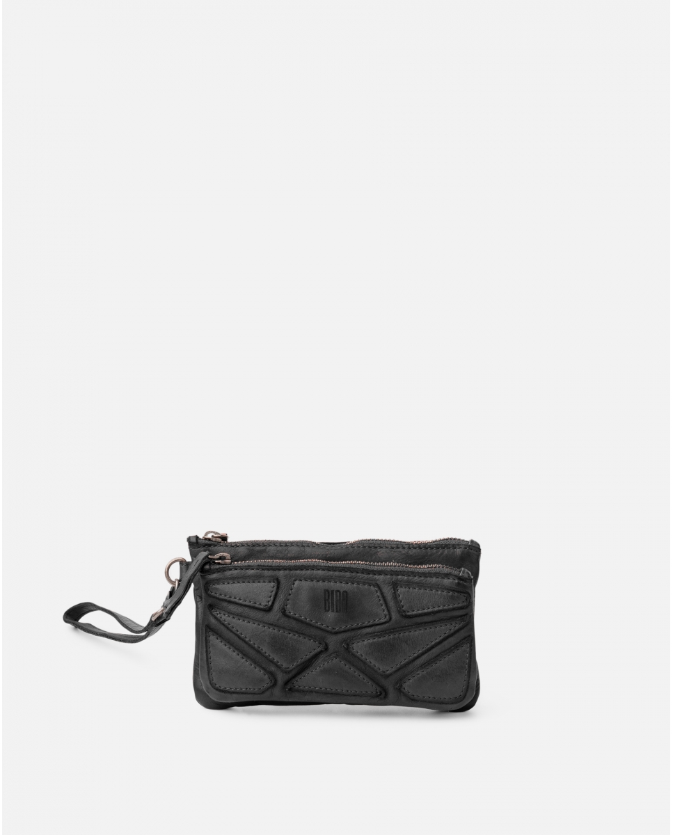 Washed and braided cowhide wallet. Frontal decorative leather patchwork. Removable clutch handle. Zipper closures. Compartments for banknotes, cards and coins. RFID security system.