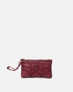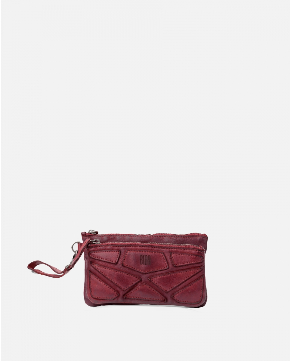 Washed and braided cowhide wallet. Frontal decorative leather patchwork. Removable clutch handle. Zipper closures. Compartments for banknotes, cards and coins. RFID security system.