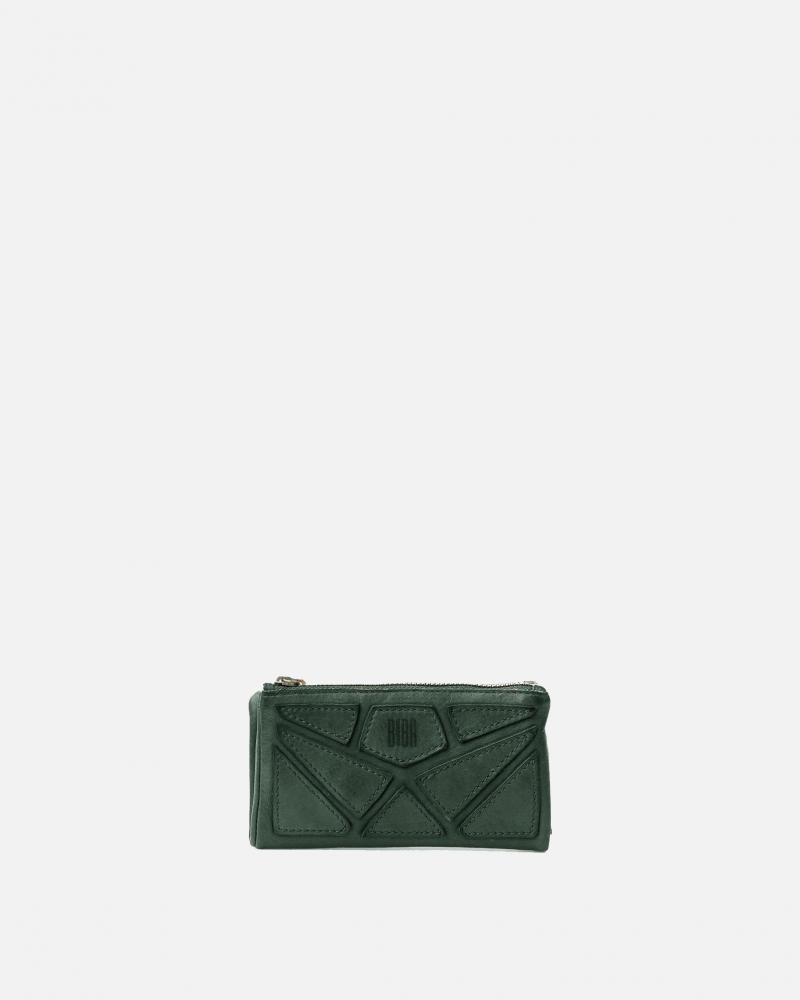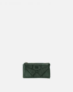 Medium washed and braided cowhide wallet. Frontal decorative leather patchwork. Button closure. Compartments for banknotes, cards and coins. RFID security system.