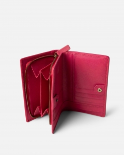 Washed and braided cowhide wallet. Button closure. Compartment for banknotes, cards and coins. RFID security system.