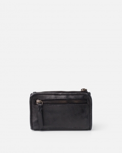Washed and vegetable-tanned cowhide leather wallet. Botton closure, and compartments por bills, cards and coins.