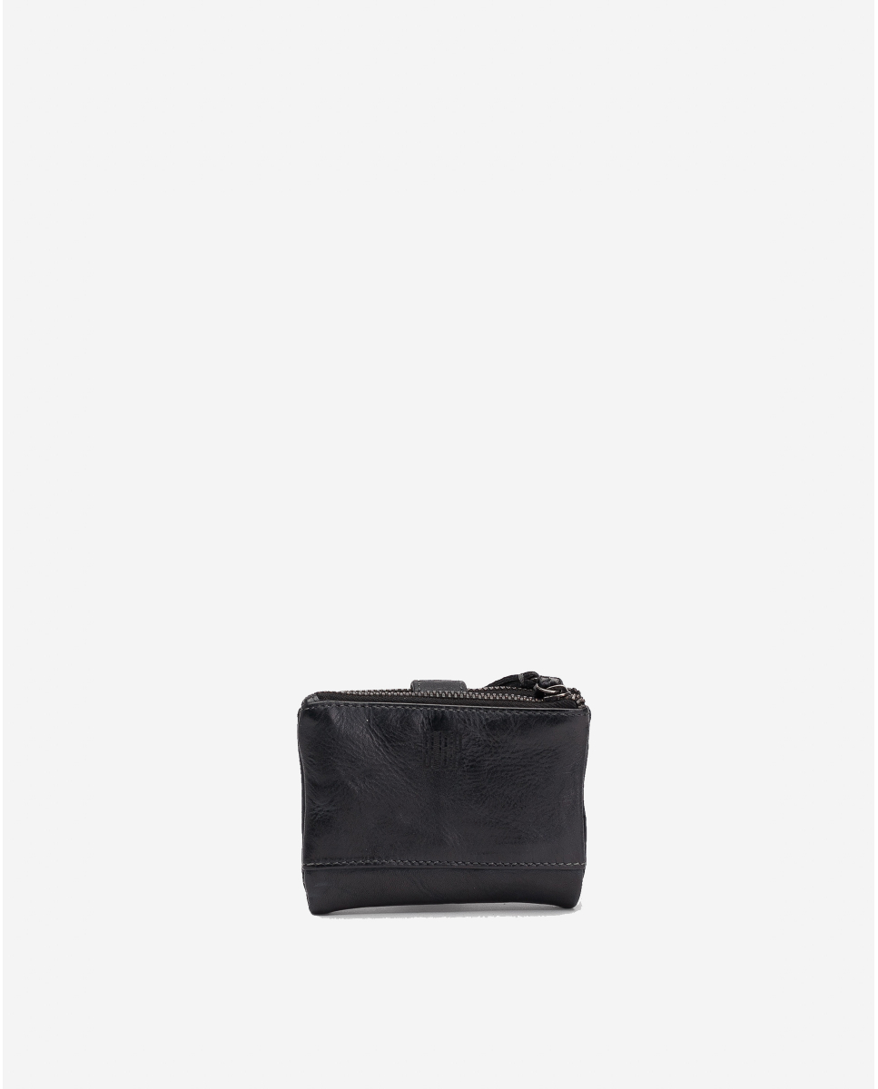 Washed, and vegetable-tanned small cowhide leather wallet. Zip closure, compartments for cards, bills, and coins.