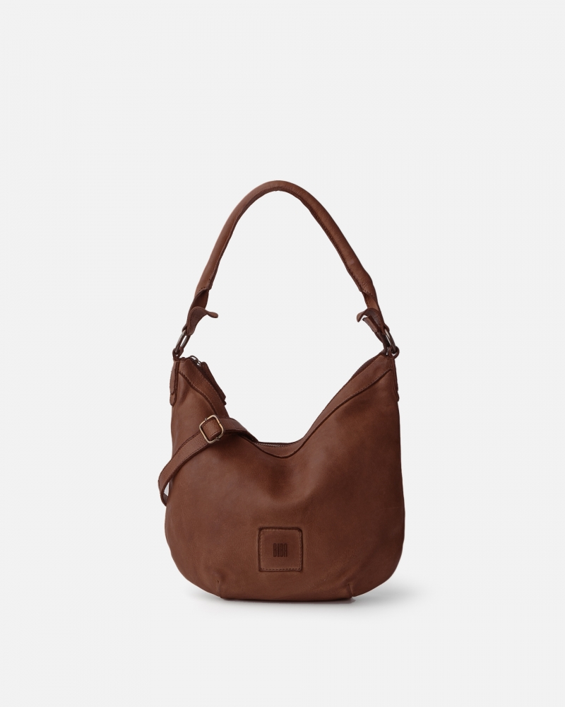 Hobo formato gondola de piel vacuna lavada. Cierre con cremallera, asa de hombro, bandolera regulable y extraible, multiples bolsillos externos e internos, y forro de algodón.