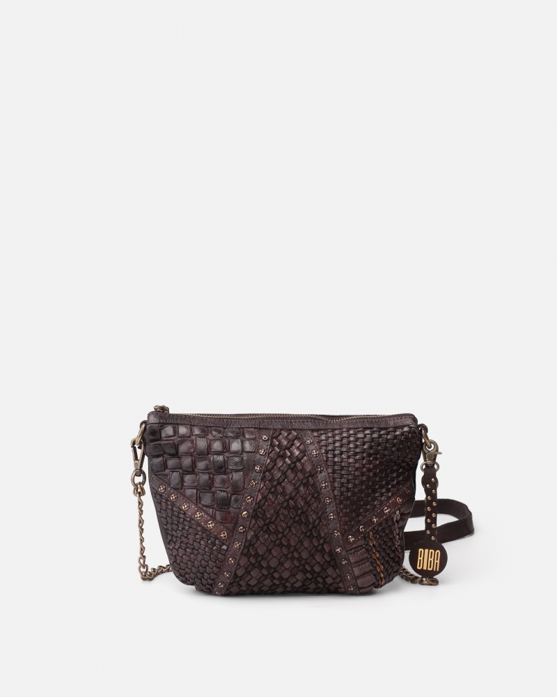 Bolso bandolera de piel vacuna lavada, y trenzada a mano. Patch work de diferentes tecnicas de trenzados, cuerdas, hilo lurex, y tachuelas. Cierre con cremallera, bandolera de piel y cadena ajustable y extraible, bolsillos internos y externos, y forro de algodon.