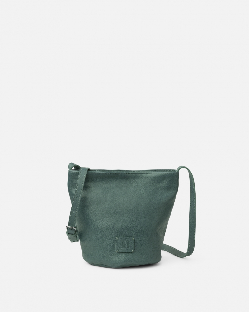 Bolso bandolera de piel vacuna. Formato cubo, bandolera ajustable, cierre con cremallera, bolsillos internos, y forro de algodón.