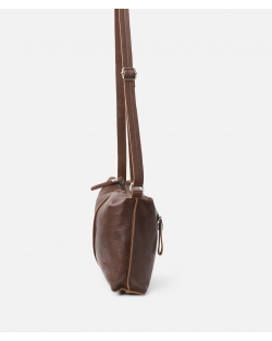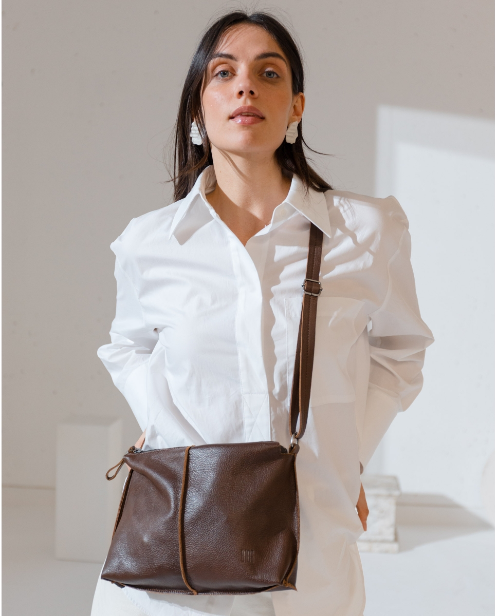 Bolso bandolera de piel vacuna. Bandolera regulable, cierre con cremallera, bolsillos externos e internos, y sin forro.