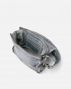Bolso bandolera de piel vacuna lavada. Pespuntes decorativos de hilo grueso. Asa de hombro extraible, bandolera regulable y extraible, solapa con boton y cierre con cremallera, bolsillos externos e internos, y forro de algodón.