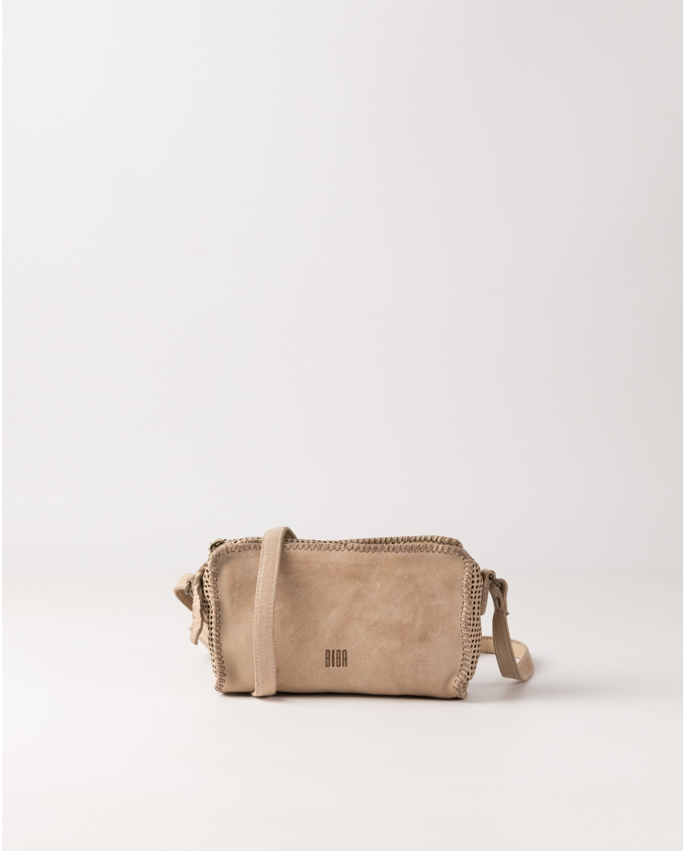 Bandolera de piel vacuna lavada y troquelada. Dos compartimientos que cierran con cremallera. Bandolera regulable. Forro de algodón.