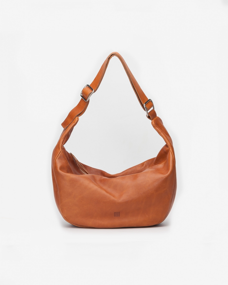 Hobo de piel vacuna de curtición vegetal. Piel de acabado brillante y elegante. Asa regulable, bolsillos internos, cierre con cremallera, y forro de algodón.