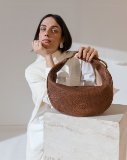 Hobo pequeño de piel ovina, efecto 'elefante' adquirido por bombeado de la piel. Asa multiposicion que permite llevarlo al hombro o cruzado. Cierre con cremallera. Bolsillos internos. Forro de algodón.