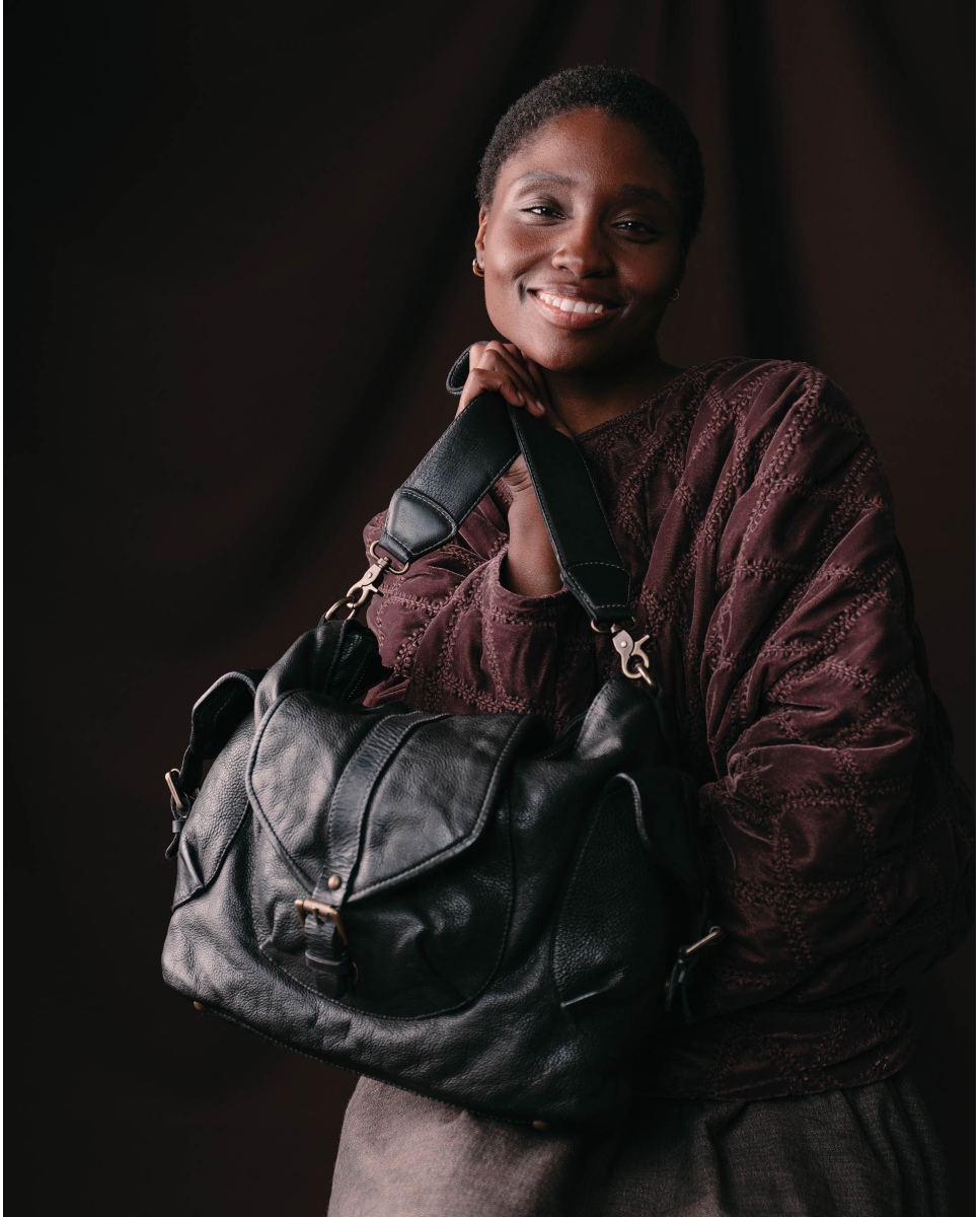 Bolso Satchel de piel vacuna lavada. Cierre con solapa y cremallera. Asa de hombro extraible. Bandolera regulable y extraible. Multiples bolsillos externos e internos. Forro de algodón.