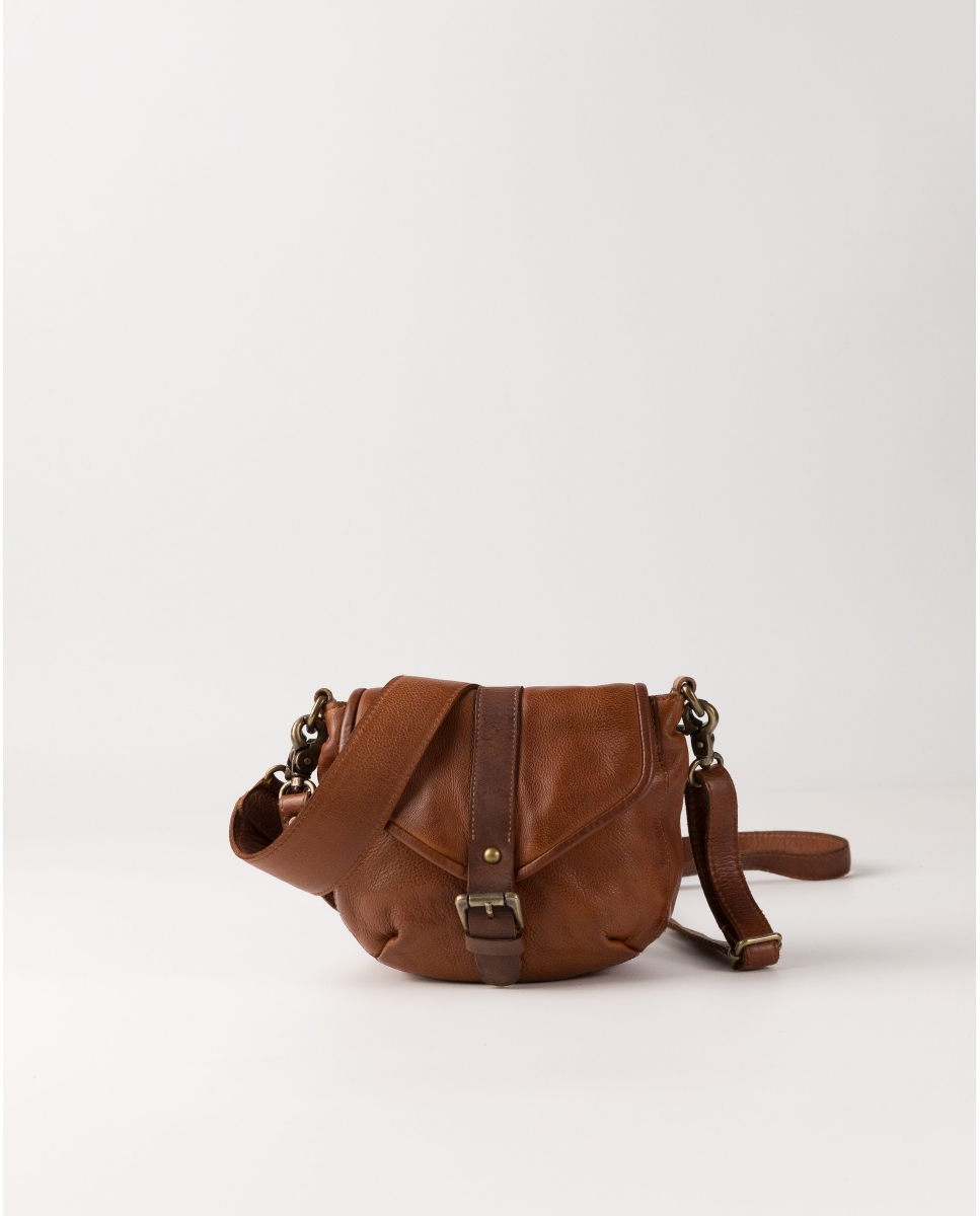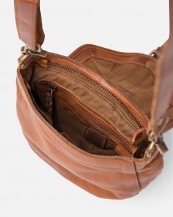 Bolso bandolera de piel vacuna lavada. Cierre con solapa y cremallera. Asa de hombro extraible. Bandolera regulable y extraible. Bolsillos externos e internos. Forro de algodón.