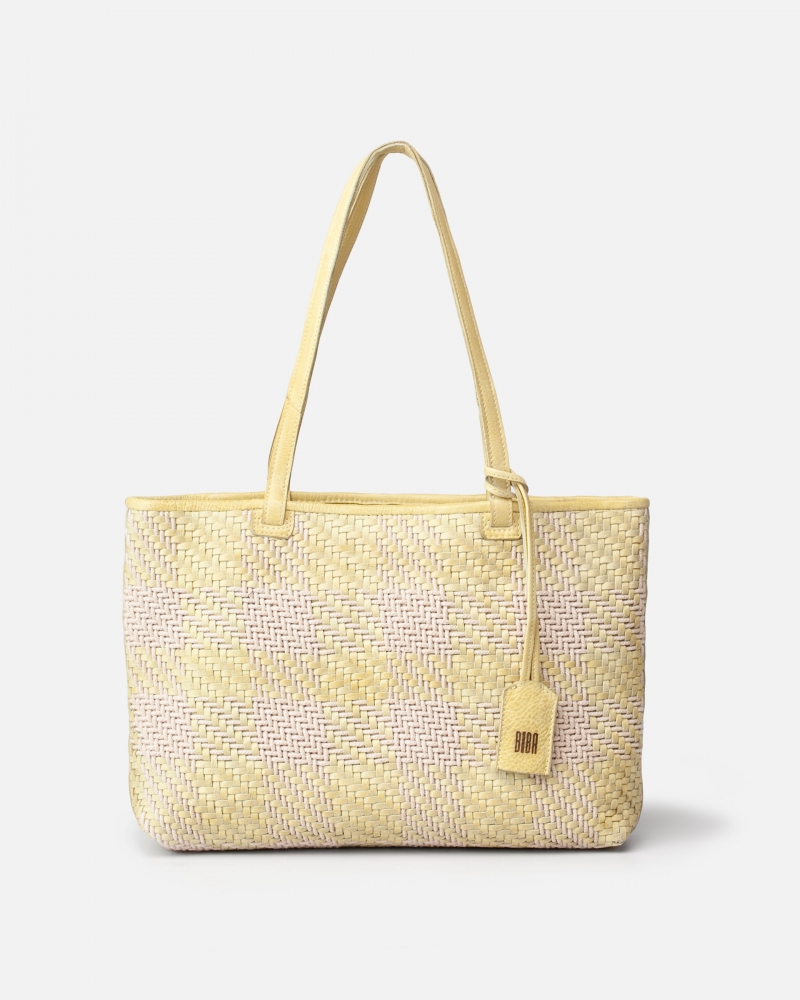 Shopper que mezcla piel vacuna lavada y de curtición vegetal, con cordón de algodón natural trenzado a mano. Las tiras de piel y de algodon se entrelazan entre si, creando un patron cuadriculado. Asas de hombro, bolsillos internos, y forro de algodón. Incluye llavero de piel.