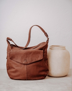 Bolso tipo hobbo de piel natural con solapa y bolsillo exterior. Cierre de cremallera, bandolera regulable y extraíble, una asa y múltiples bolsillos interiores.