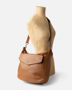 Bolso tipo hobbo de piel natural con solapa y bolsillo exterior. Cierre de cremallera, bandolera regulable y extraíble, una asa y múltiples bolsillos interiores.