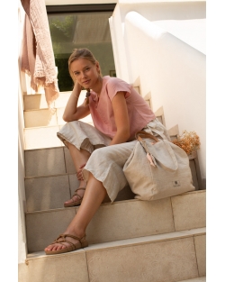 Bolso shopping de lino. Reversible. Asas de piel natural. Cierre de botón.