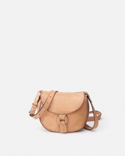 Bolso bandolera de piel vacuna lavada, y de curtición vegetal. Los bordes del bolso están oscurecidos, creando un efecto de profundidad. Cierre con solapa e imán, bandolera regulable, bolsillo interno, y sin forro de algodón.