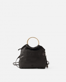 Bolso de mano de piel vacuna lavada. Aros metalicos como asas de mano. Cierre con cremallera. Bandolera regulable y extraible. Bolsillos internos. Forro de algodón.