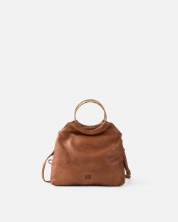 Bolso de mano de piel vacuna lavada. Aros metalicos como asas de mano. Cierre con cremallera. Bandolera regulable y extraible. Bolsillos internos. Forro de algodón.