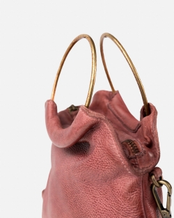Bolso de mano de piel vacuna lavada. Aros metalicos como asas de mano. Cierre con cremallera. Bandolera regulable y extraible. Bolsillos internos. Forro de algodón.