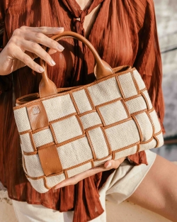 Bowling que combina piel vacuna lavada y lino. Asas de mano. Cierre con boton. Bandolera regulable y extraible. Dos compartimientos internos. Multiples bolsillos internos. Forro de algodón.