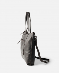 Shopper de piel vacuna. Bandolera ajustable y extraíble, cierre con botón, bolsillos internos y externos.