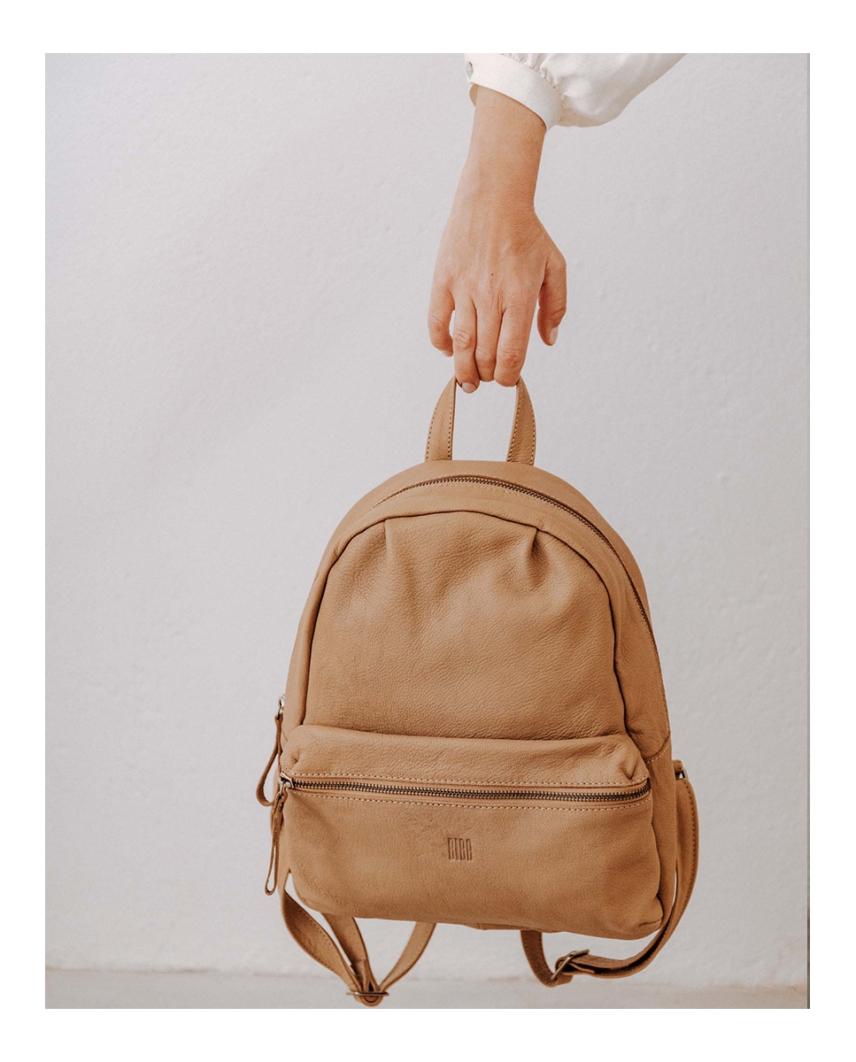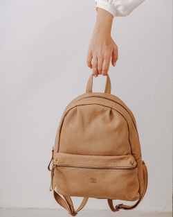 Mochila de piel natural con bolsillo exterior. Cierre de cremallera, dos asas regulables y múltiples bolsillos interiores.
