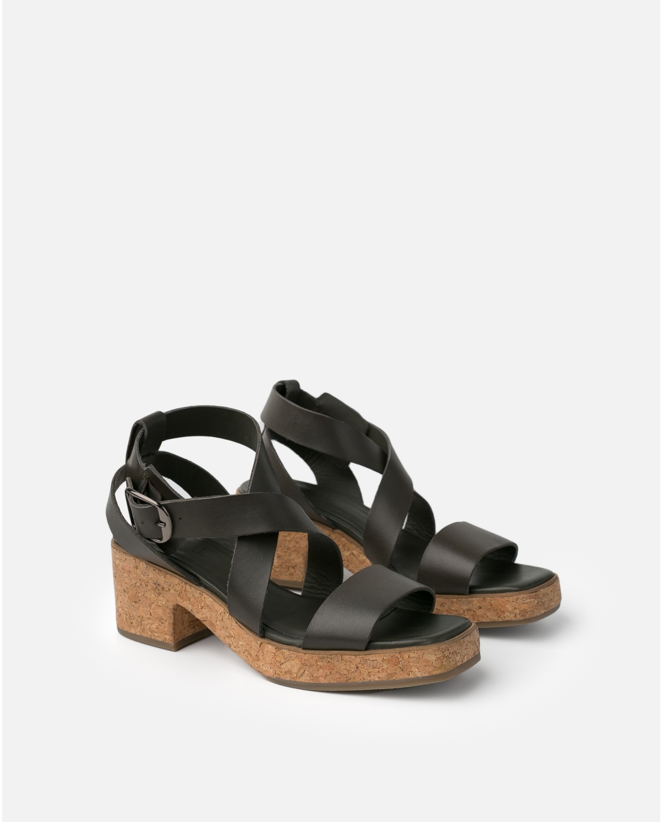 Sandalia de piel vacuna, plantilla de goma EVA y corcho forrada en piel ovina, y suela de cauch . Tira de sujecion al tobillo.