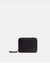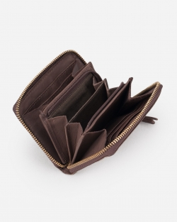Billetero mediano de piel vacuna, lavada, y de curtición vegetal. Cierre con cremallera, compartimientos para tarjetas y monedas.