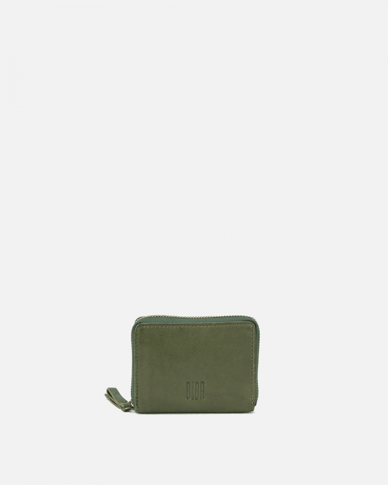 Billetero pequeño de piel vacuna, lavada, y de curtición vegetal. Cierre con cremallera, y compartimientos para tarjetas.