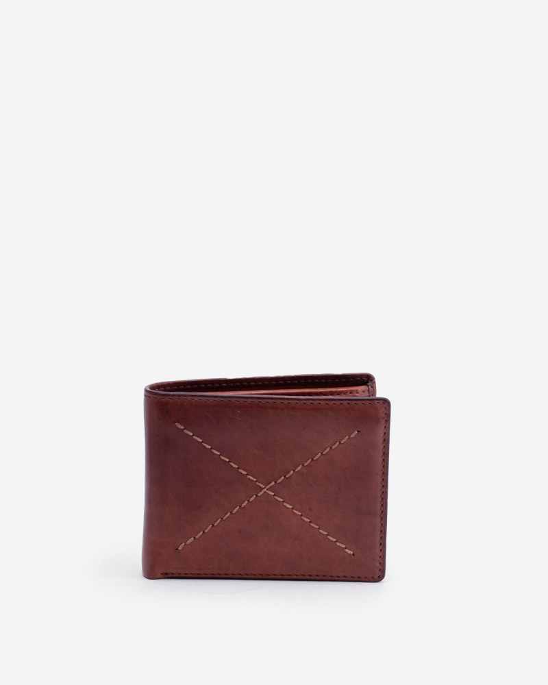 Billetero de piel natural con detalle de pespunte en la parte frontal. Varios departamentos para las tarjetas y papeles. Múltiples espacios para los billetes. Bolsillo con solapa y cierre a presión.