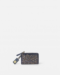 Billetero mediano de piel vacuna lavada. Tachuelas metalicas en la parte frontal. Compartimientos para tarjetas, billetes, y monedas. Sistema de seguridad RFID.