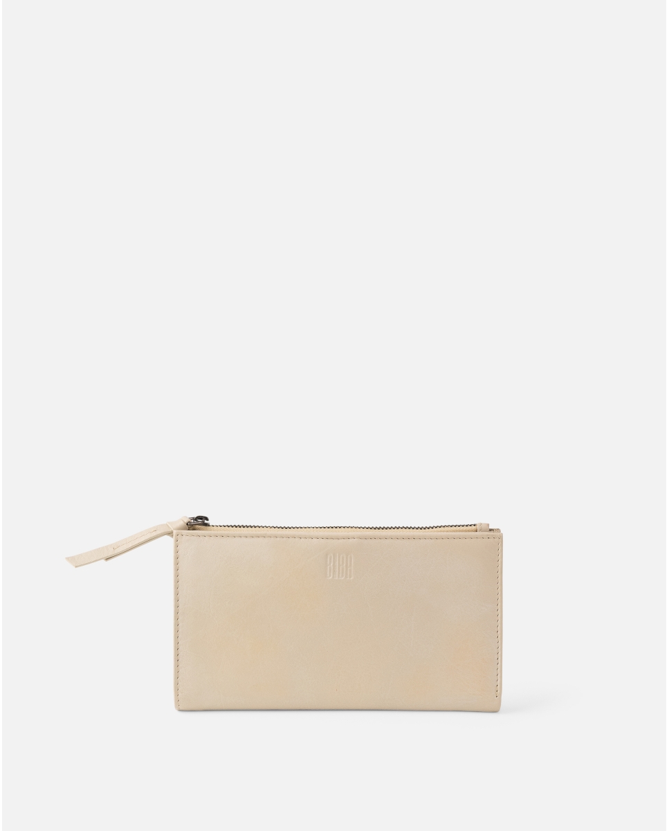 Billetero grande de piel natural muy suave efecto vintage. Múltiples departamentos para las tarjetas. Espacio para los billetes y bolsillo con cremallera en el dorso. Cierre a presión.