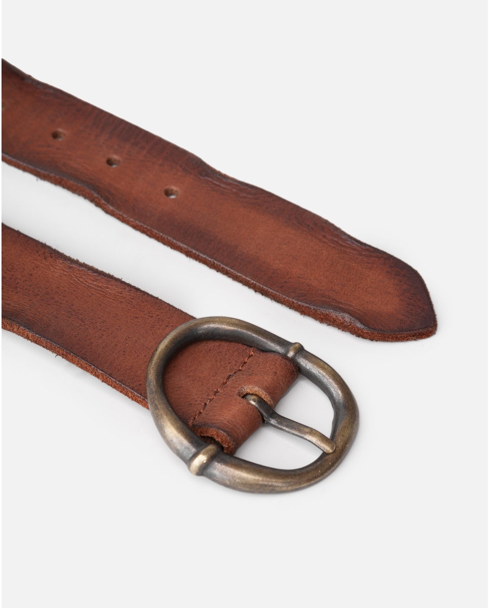Cinturon de piel bovina. Tornillo trasero para cortarlo manualmente. Hebilla asimétrica color oro viejo.